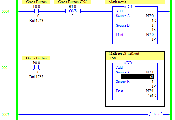 Rung 0 uses the ONS instruction you learned in RsLogix 500 - Flip Flop - One Shots ONS OSR OSF lesson which executes the ADD instruction once every time that the Green Button is pressed. Rung 1 does not have the ONS. Press the Green Button and release it as fast as you can, once. You should now see N7:0 at 1 but N7:1 will be at a higher number. Without the ONS the ADD instruction in Rung 1 was executed on each scan. In the example below, the PLC scanned 161 times while the Green Button was pressed.